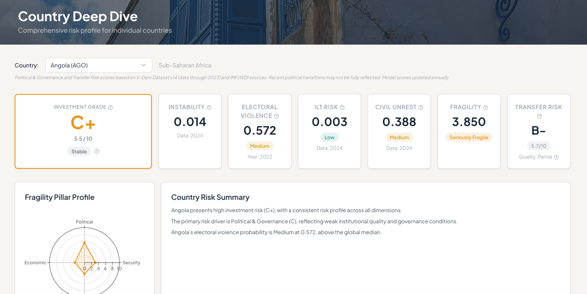 Byrsa's quantitative platform delivers composite investment grades, transfer risk ratings, political and governance scores, and instability probabilities. Our four predictive models were trained on more than 10,000 country-year observations spanning six decades and 180+ countries — drawing on indicators covering democratic institutions, civil-military relations, conflict history, leadership transitions, and economic conditions. Accessible via subscription, with coverage and functionality updated continuously as new data and events warrant.
